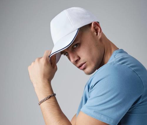 TearAway label for ease of rebranding. 5 panel design. Structured front panel. Contrasting colour piped peak edge. Pre-curved peak. Stitched ventilation eyelets. Perfect for print and embroidery. Self-fabric strap with tri-glide buckle.