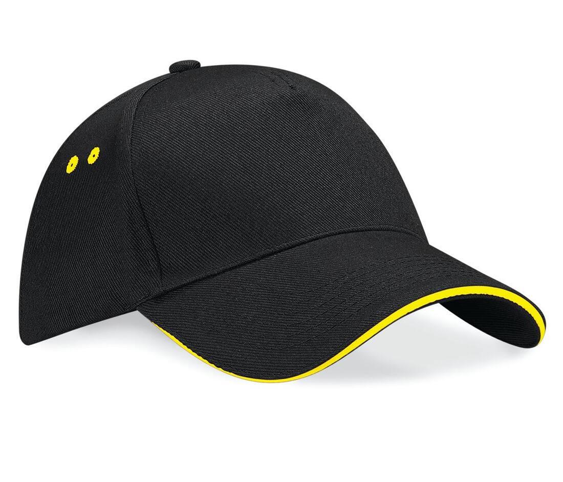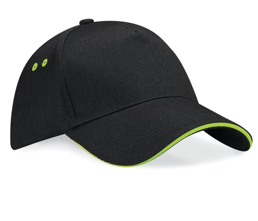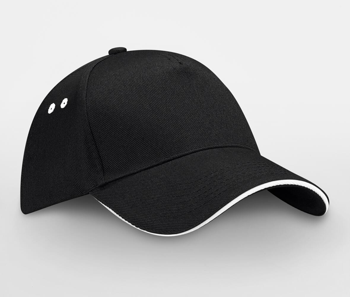 5 panel design. Pre-curved peak. Contrasting colour sandwich peak and ventilation eyelets. Perfect for print and embroidery. Rip-Strip™ size adjuster.
