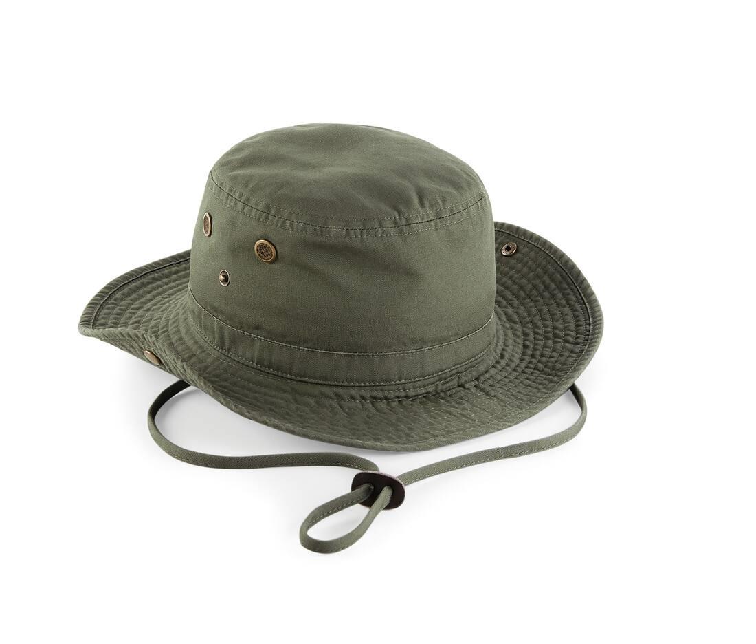 Conforms to BS8466. Flat top. Protection against sunlight - UPF50+. Mesh eyelets. Press stud side turn-ups. Chin strap with leather toggle. Elasticated cord size adjuster with toggle. One size fits most.