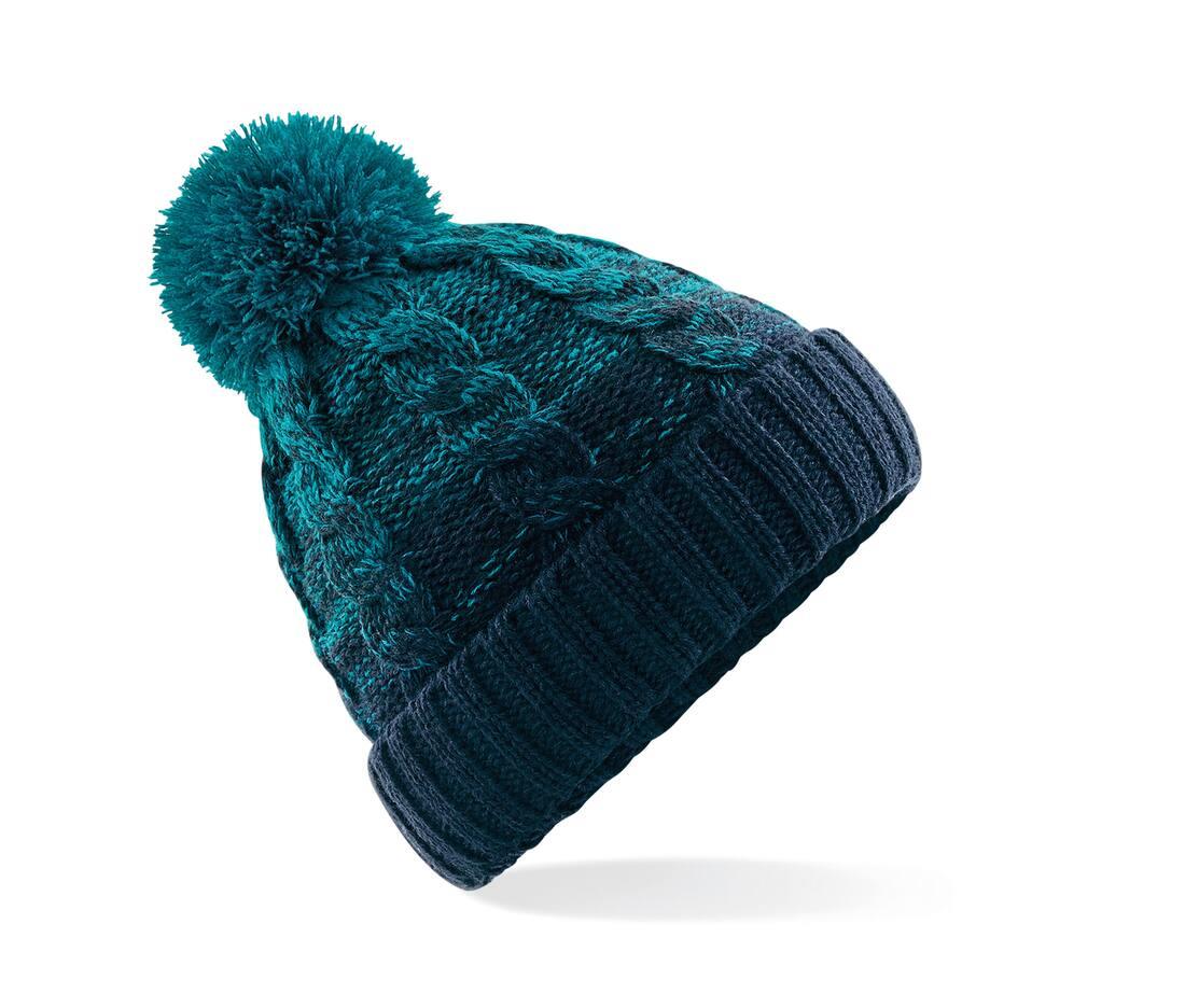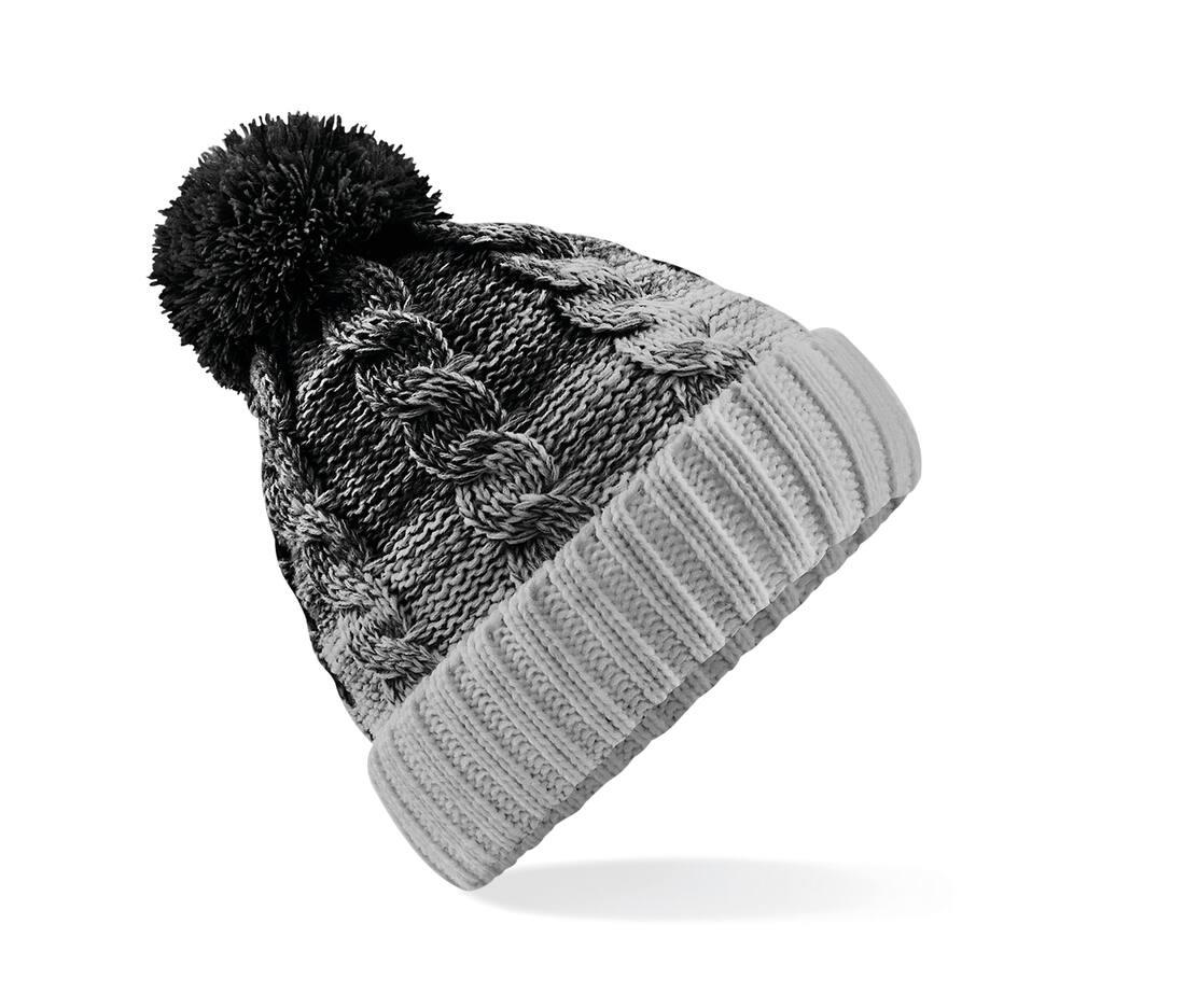 TearAway label for ease of rebranding. Cuffed design for optimal decoration. Heavyweight multi yarn cable knit design. Self-coloured pom pom.
