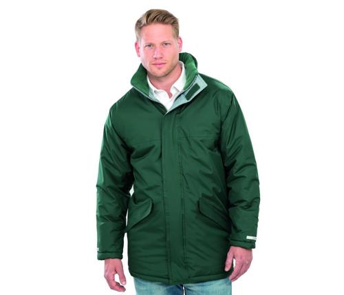 Windproof and waterproof. Fully taped seams. Long fit. High collar design with fleece lining. Concealed 3 panel fold-away adjustable hood in collar. Full front zip fastening with storm flap. Front pockets with storm flaps and fleece lined pockets. Inner elasticised cuff & reflective cuff detail. Inside pockets. Adjustable drawcord hem. 2 front pockets. Zipped inside pocket.