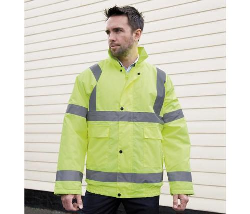 Foldaway hood with drawstring adjuster. Reflective safety arm & shoulder bands. Heavy duty two way zip. Stud closing storm flap. Diamond quilted lining. Elasticated waist band. Fully taped seams. Tough & durable. Patch pockets. Inside pocket. Comfort fit.