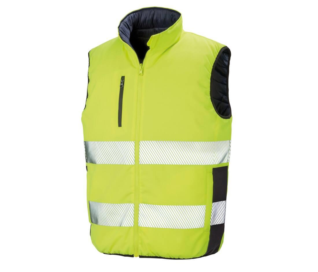 Reversible double use. Quiet to wear. Reflective print body bands. Navy colour reverse contrast and trim. Soft bound armhole and hem. Zipped pockets. EN ISO 20471:2013 + A1:2016 . RIS-3279-TOM ISSUE 2:2019 (orange only).