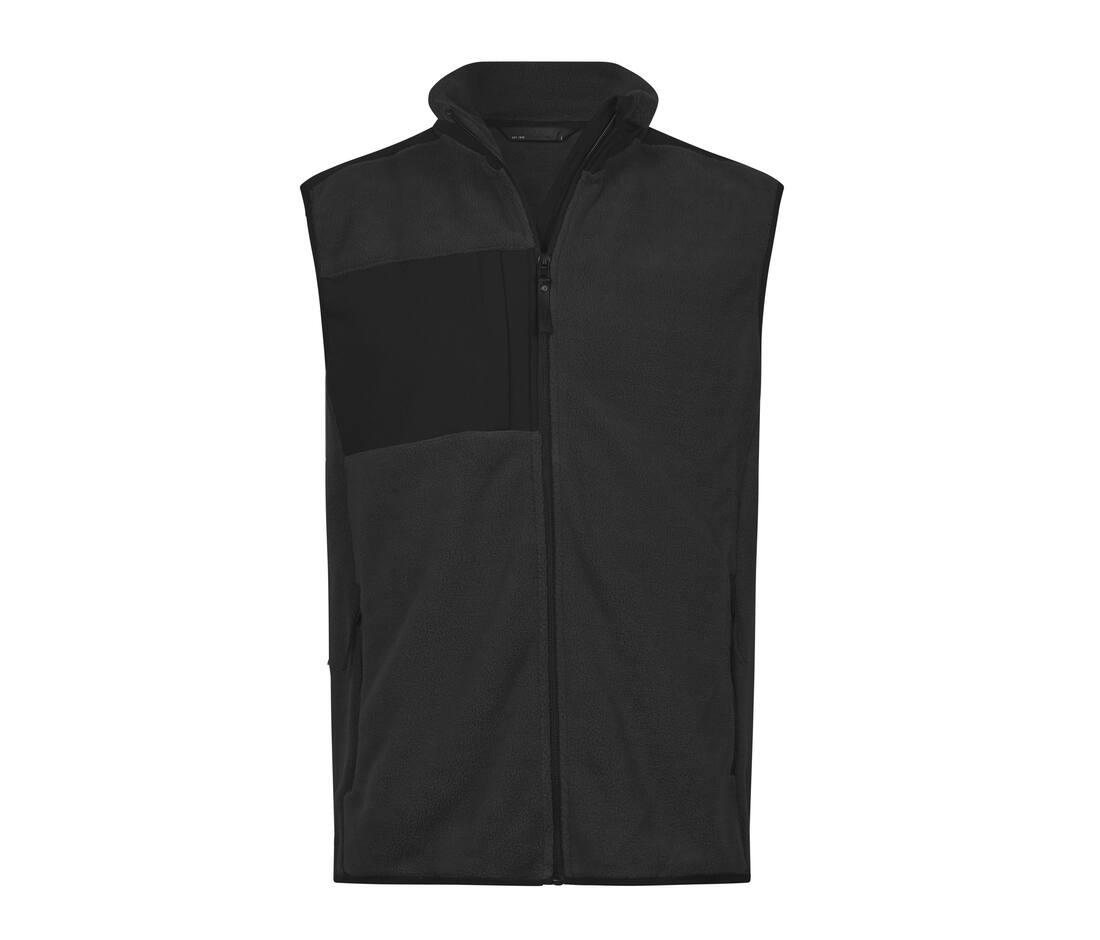Heavy and soft polyester fleece bodywarmer. Reinforced ripstop polyester panels on shoulders. Chest pocket. 2 front pockets with zippers. Elastic banding at sleeve hem. SBS zippers.