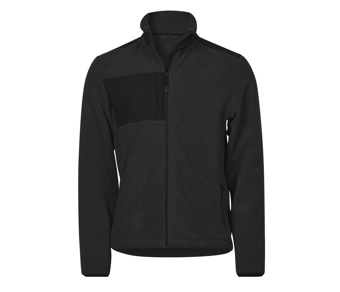 Heavy and soft polyester fleece. Reinforced ripstop polyester panels on shoulders and elbows. Chest pocket. 2 front pockets with zippers. Elastic banding at sleeve hem. SBS zippers.