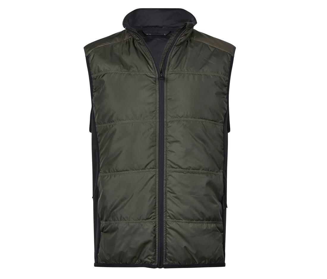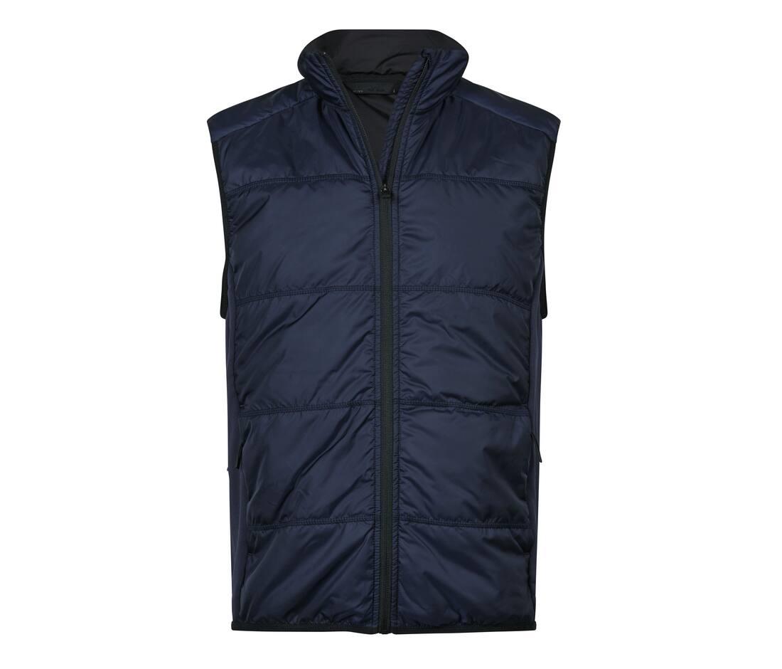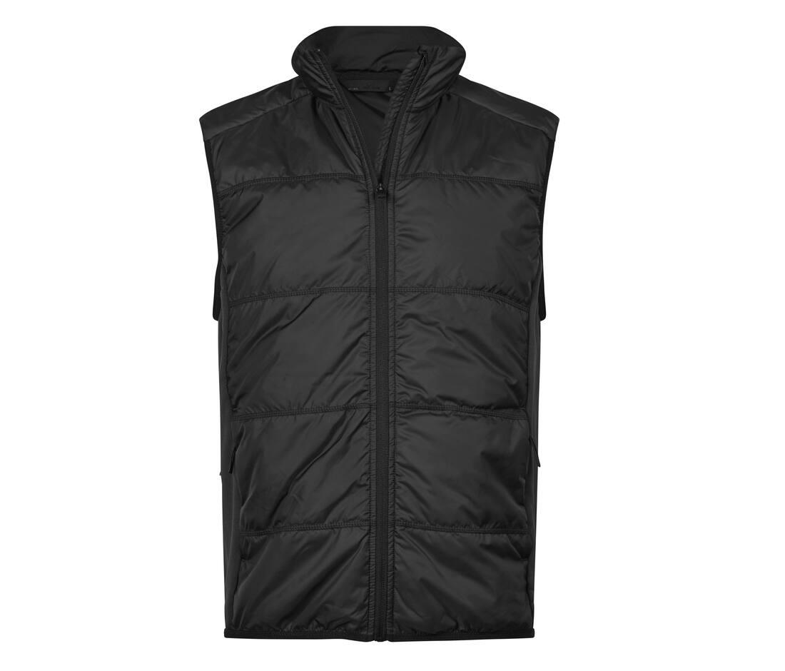 Combination of stretch fleece and woven fabric. DuPont™ padding insulation. Tailored fit. Elastic side panels. 2 hidden front pockets with zippers. Inner pocket. Elastic banding at armhole. Stand up collar. SBS zippers.